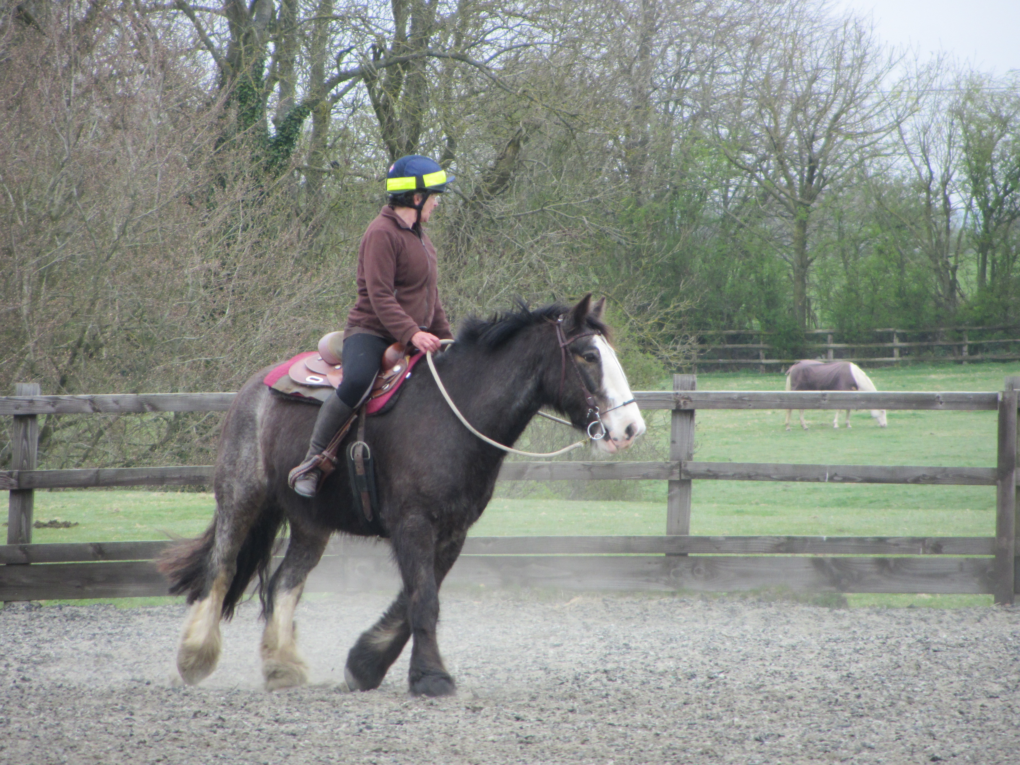Day 3 at JRFS – more flexion today this time leg yielding on a circle with Rebecca, got a better circle and change of rein online. Benny getting better at the forequarter and hind quarter yields ridden. Then after the 10 minutes trotting on both reins. to find rhythm and relaxation. we did leg yielding on a circle. Then it was time to try a canter, got a few strides on the right rein with a few half circles but couldn’t maintain gait for a whole circuit of the school. The left rein was worse with both of us struggling on our stiffer side, just managed a few strides. In the afternoon we joined the other students for a lesson with Vicky. Again working on flexion and impulsion. A more forward walk and trot and sideways out of a circle. Then on to counter bends on a circle to improve suppleness and softness. We then did some shoulder in and haunches in – Vicky was quite impressed that Benny could do them – and so was I. The back to finding more rhythm and elevation in the trot by using poles and then raised poles. Benny managed very well and only kicked the poles once.
