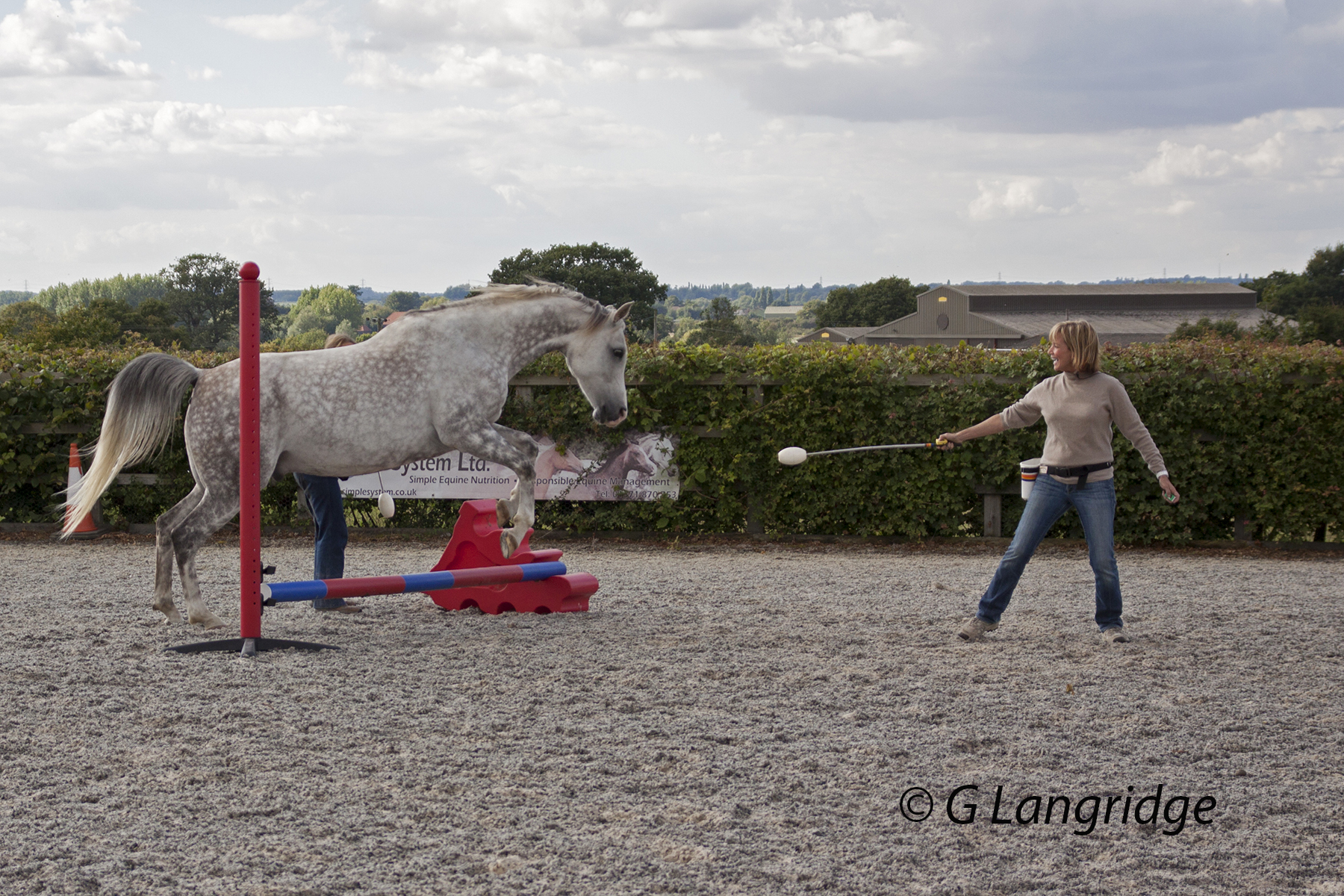 Shawna then inadvertently demonstrated “greedy trainer syndrome”. This is where the trainer asks more of the horse than they can cope with, in this case Shawna raised the jump and over faced the horse. The fence was lowered and he jumped a couple of times and then was jackpot reinforced and allowed to run round freely, as an end to the session.