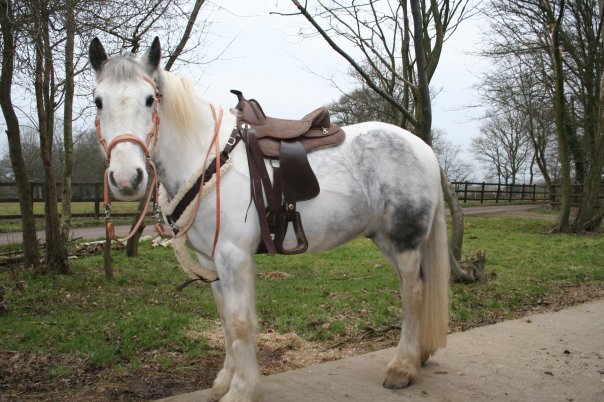I now have another cob called Mojo – he is 15hh and piebald. He was very sensitive to everything – so I have been desensitising him to fly spray and tack.
